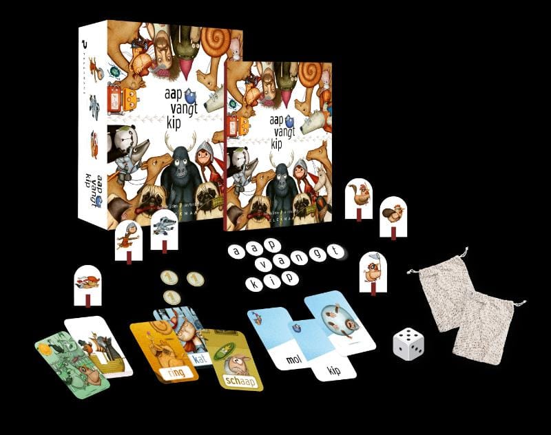aap vangt kip is het spel bij het boek aap zoekt een woord. Het is een mooie aanvulling op het woordenzoekboek, maar het kan ook perfect zonder boek worden gebruikt.