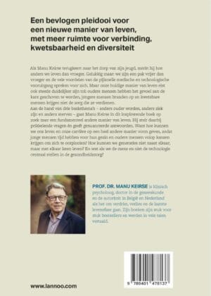 Aan de hand van drie basisthema’s – anders ouder worden, anders ziek zijn en anders sterven – gaat Manu Keirse in dit inspirerende boek op zoek naar een fundamenteel andere manier van leven. Hij stelt daarbij prikkelende vragen én geeft genuanceerde antwoorden. Want hoe kunnen we ons leven en onze carrière op een heel andere manier vorm geven, zodat jonge mensen tijd hebben voor hun gezin en oudere mensen volop kansen krijgen om zich te ontplooien? Hoe kunnen we generaties niet naast elkaar, maar met elkaar laten leven? En wat als we de mens en niet de technologie centraal stellen in de gezondheidszorg?