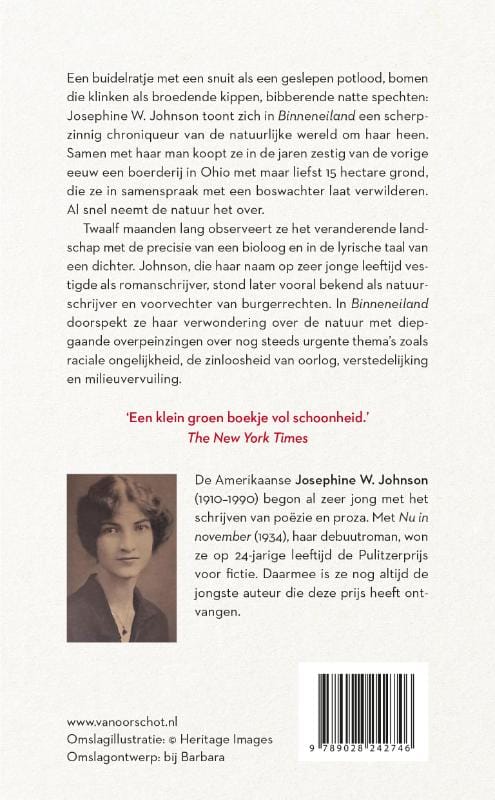 Een buidelratje met een snuit als een geslepen potlood, bomen die klinken als broedende kippen, bibberende natte spechten: Josephine W. Johnson toont zich in Binneneiland een scherpzinnig chroniqueur van de natuurlijke wereld om haar heen. Samen met haar man koopt ze in de jaren zestig van de vorige eeuw een boerderij in Ohio met maar liefst 15 hectare grond, die ze in samenspraak met een boswachter laat verwilderen. Al snel neemt de natuur het over.