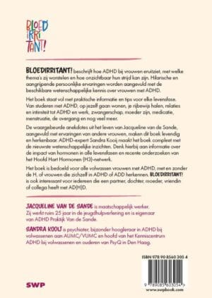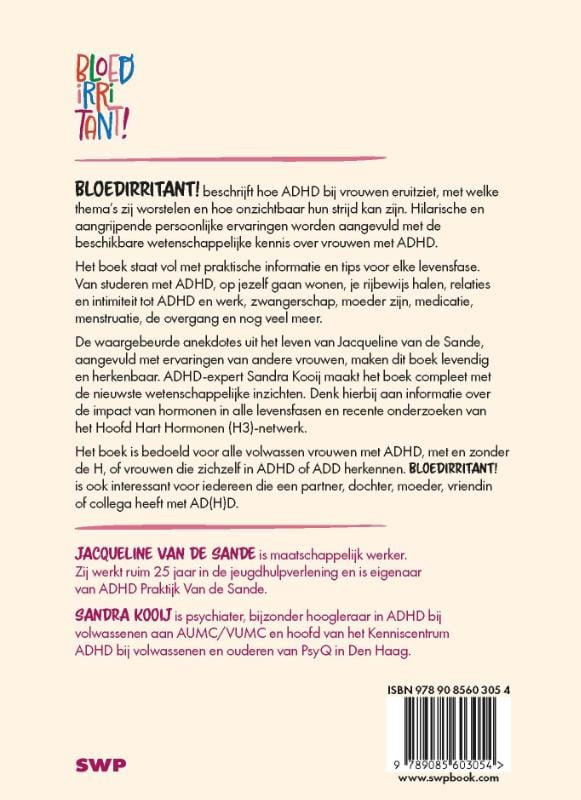 ‘Bloedirritant!’ beschrijft hoe ADHD bij vrouwen eruitziet, met welke thema’s zij worstelen en hoe onzichtbaar hun strijd kan zijn. Hilarische en aangrijpende persoonlijke ervaringen worden aangevuld met de beschikbare wetenschappelijke kennis over vrouwen met ADHD.
