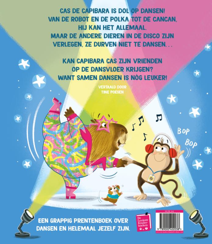 Cas de capibara is dol op dansen! Van de robot en de polka tot de cancan, hij kan het allemaal. Maar de andere dieren in de disco zijn verlegen en durven niet te dansen… Kan capibara Cas zijn vrienden overtuigen om ook een dansje te wagen? Samen dansen is immers veel leuker!