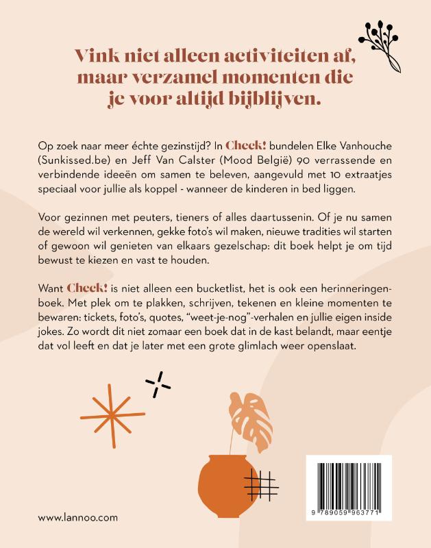 Op zoek naar meer échte gezinstijd? In Check! bundelen Elke Vanhouche (Sunkissed.be) en Jeff Van Calster (Mood België) 90 verrassende en verbindende ideeën om samen te beleven, aangevuld met 10 extraatjes speciaal voor jullie als koppel – wanneer de kinderen in bed liggen.