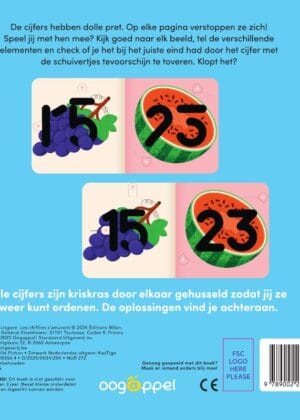 De cijfers hebben dolle pret. Op elke pagina verstoppen ze zich!Speel jij met hen mee? Kijk goed naar elk beeld, tel de verschillende elementen en check of je het bij het juiste eind had door het cijfer met de schuivertjes tevoorschijn te toveren. Klopt het?