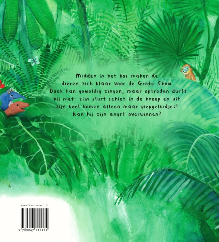 Arme Duuk! hij is dol op muziek, maar durft alleen te zingen als niemand hem kan horen. En dat terwijl hij een geweldige stem heeft! Als de dieren in het bos een Grote Show organiseren, wil Duuk wel optreden. Maar zijn slurf schiet in de knoop en uit zijn keel komen alleen maar piepgeluidjes… Zijn knieën knikken, zijn oren gloeien en zijn stem stokt. Zal het Duuk lukken zijn angst te overwinnen?
