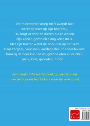 Van ’s ochtends vroeg tot ’s avonds laat werkt de boer op zijn boerderij. Hij zorgt er voor alle dieren die er wonen. De kippen leggen elke dag een eitje voor hem en de koeien geven hem elke dag verse melk.