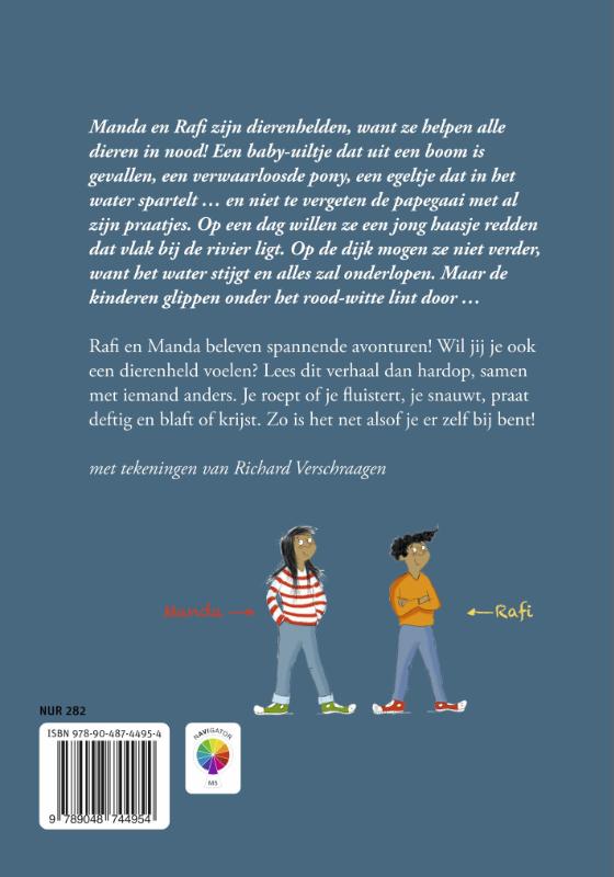 In dit spannende toneelleesboek op AVI M5 redden Manda en Rafi alle dieren in nood. Maar wat te doen als een babyhaasje te dicht bij de rivier ligt en het water stijgt? Rafi en Manda glippen toch stiekem onder het rood-witte lint door, maar of dat slim is?