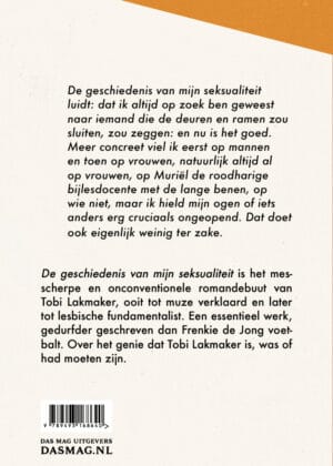 De geschiedenis van mijn seksualiteit is het messcherpe en onconventionele romandebuut van Tobi Lakmaker, ooit tot muze verklaard en later tot lesbische fundamentalist. Een essentieel werk, gedurfder geschreven dan Frenkie de Jong voetbalt. Over het genie dat Tobi Lakmaker is, was of had moeten zijn.
