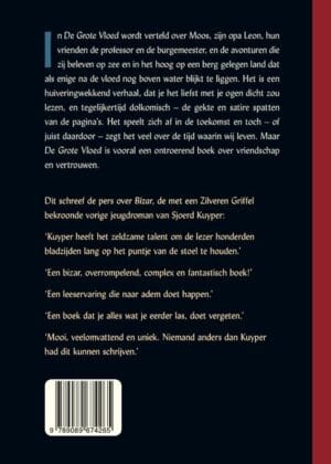 In ‘De Grote Vloed’ wordt verteld over Moos, zijn opa Leon, hun vrienden de professor en de burgemeester, en de avonturen die zij beleven op zee en in het land op de enige berg die na de vloed nog boven water uitsteekt. Het is een huiveringwekkend verhaal, dat je het liefst met je ogen dicht zou lezen, maar het is tegelijkertijd dolkomisch, de pret spat van de pagina’s, en filosofisch. Het speelt zich af in de toekomst en toch – of juist daardoor – zegt het veel over de tijd waarin wij leven. Maar De Grote Vloed is vooral een ontroerend boek over vriendschap en vertrouwen.