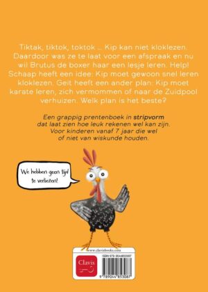 Tiktak, tiktok, toktok … Kip kan niet kloklezen. Daardoor was ze te laat voor een afspraak en nu wil Brutus de boxer haar een lesje leren. Help! Schaap heeft een idee: Kip moet gewoon snel leren kloklezen. Geit heeft een ander plan: Kip moet karate leren, zich vermommen of naar de Zuidpool verhuizen. Welk plan is het beste?