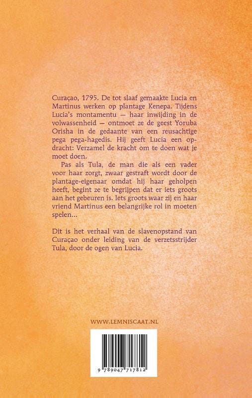 Curaçao, 1795. Tijdens Lucia’s montamentu – haar inwijding in de volwassenheid – ontmoet ze de geest Yoruba Orisha in de gedaante van een reusachtige pega pega-hagedis. Pas als Tula, de man die als een vader voor haar zorgt, zwaar gestraft wordt omdat hij haar geholpen heeft, begint ze te begrijpen dat er iets groots aan het gebeuren is. Iets groots waar zij en haar vriend Martinus een belangrijke rol in moeten spelen.