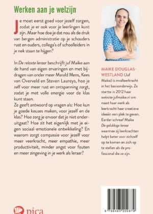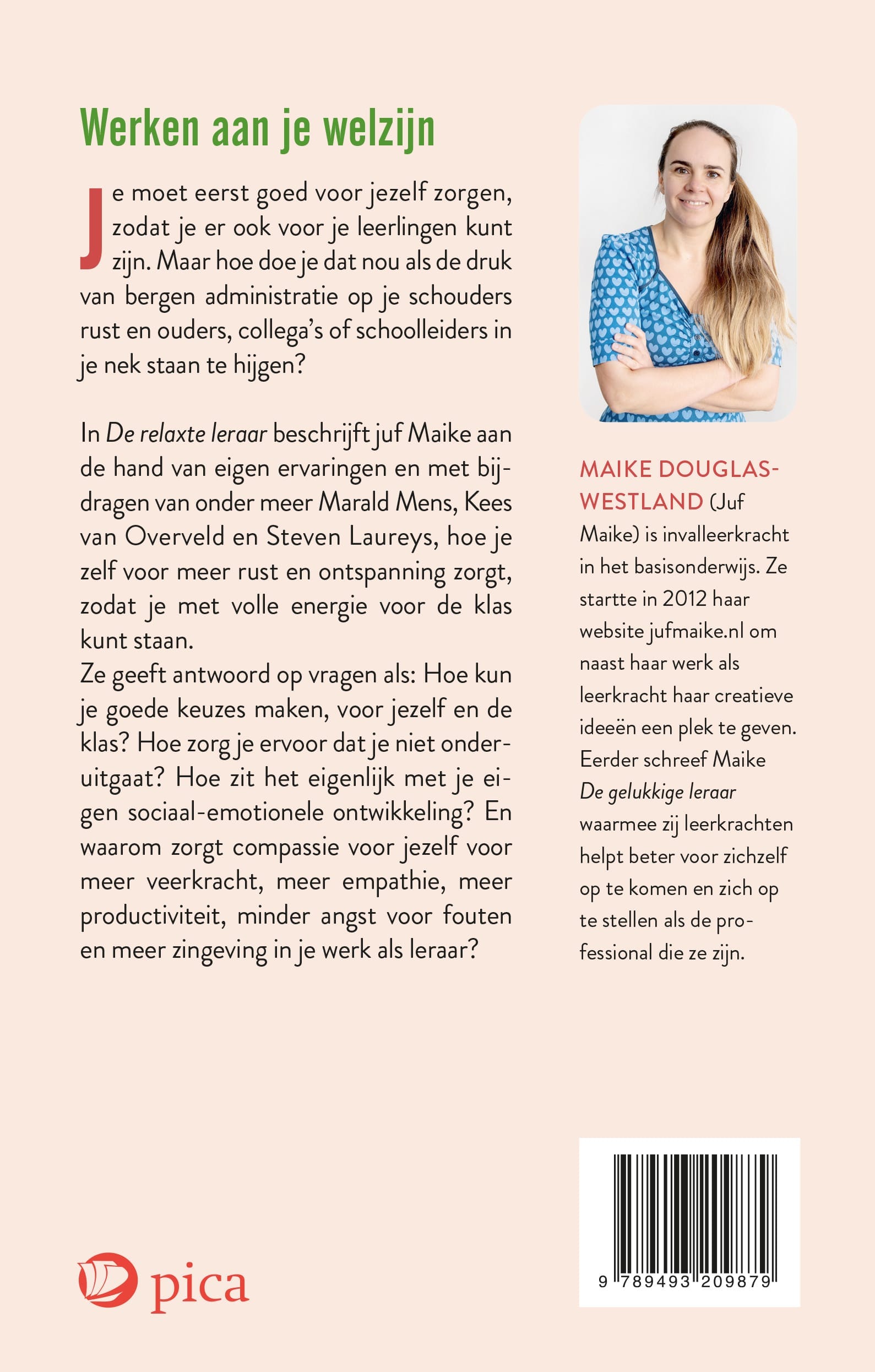 In De relaxte leraar beschrijft juf Maike aan de hand van eigen ervaringen en met bijdragen van onder meer Marald Mens, Kees van Overveld en Steven Laureys, hoe je zelf voor meer rust en ontspanning zorgt, zodat je met volle energie voor de klas kunt staan.