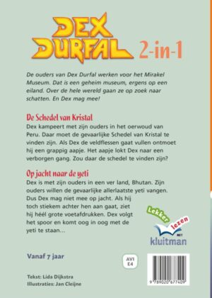 In ‘Op jacht naar de yeti’ (deel 2 van de serie Dex Durfal) gaan de ouders van Dex op zoek naar een verschrikkelijke sneeuwman. Dex mag niet mee op jacht, want dat is te gevaarlijk. Stiekem doet hij het toch en hij volgt een spoor van grote voetafdrukken. Dan loopt hij de yeti tegen het lijf…