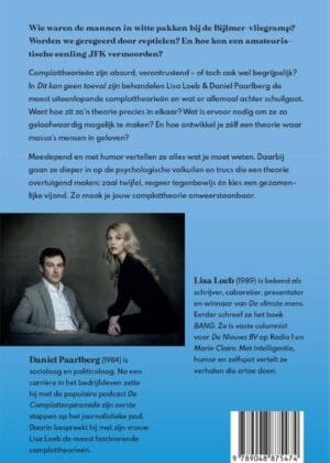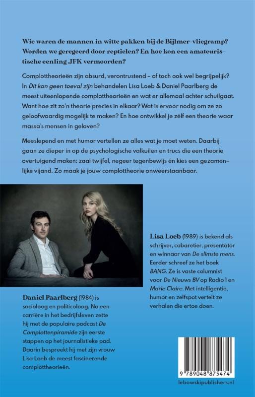 Complottheorieën zijn absurd, verontrustend – of toch ook wel begrijpelijk? In Dit kan geen toeval zijn behandelen Lisa Loeb & Daniel Paarlberg de meest uiteenlopende complottheorieën en wat er allemaal achter schuilgaat. Want hoe zit zo’n theorie precies in elkaar? Wat is ervoor nodig om ze zo geloofwaardig mogelijk te maken? En hoe ontwikkel je zélf een theorie waar massa’s mensen in geloven?