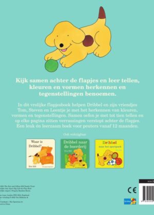 In Dribbels grote flapjesboek helpen Dribbel en zijn vriendjes Tom, Steven en Leentje je met het herkennen van kleuren, vormen en tegenstellingen. Samen oefen je met tot tien tellen en op elke pagina zitten verrassingen verstopt achter de flapjes. Het kartonboek is stevig en de flapjes zijn makkelijk te openen voor kleine handjes. Een leuk én leerzaam boek voor peuters vanaf 12 maanden.