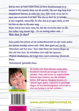 Stel je voor. Je heet Goos Guts, je bent doodnormaal en je woont in het saaiste dorp van de wereld. Op een dag loop je je slaapkamer binnen, je ruikt iets vies, kijkt rond, en je ziet ineens een mummie in je bed. Wat doe je dan? Ja, je schrikt je een ongeluk, natuurlijk. En dan doe je je ogen dicht, je telt tot tien en dan is hij weer weg. Maar stel je nou eens voor, hè, dat die mummie daar na die tien tellen nog steeds ligt En na twintig tellen ook! Wat doe je dan?