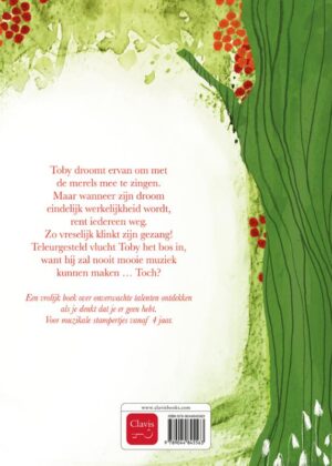 Toby droomt ervan om met de merels mee te zingen. Maar wanneer zijn droom eindelijk werkelijkheid wordt, rent iedereen weg. Zo vreselijk klinkt zijn gezang! Teleurgesteld vlucht Toby het bos in, want hij zal nooit mooie muziek kunnen maken … Toch?Een vrolijk boek over onverwachte talenten ontdekken als je denkt dat je er geen hebt. Voor muzikale stampertjes vanaf 4 jaar.