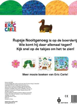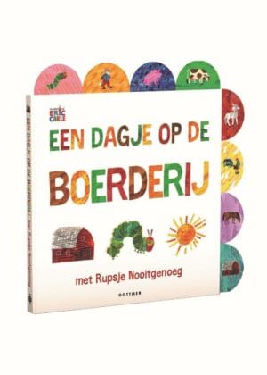 In ‘Een dagje op de boerderij met Rupsje Nooitgenoeg’ gaat Rupsje Nooitgenoeg naar een van de lievelingsplekken van peuters: de kinderboerderij! Wie komt Rupsje allemaal tegen? Slimme peuters kunnen het al voorspellen door op de 8 tabjes te kijken die langs twee zijden van het boek zitten. Bij welk dier zullen ze als eerste op bezoek gaan? Of gaan ze liever even kijken bij de boer zelf, of in de grote rode schuur? Het kartonboek heeft een groot formaat en de tabjes helpen de peuters om zelfstandig heen en weer te bladeren en aan te wijzen.