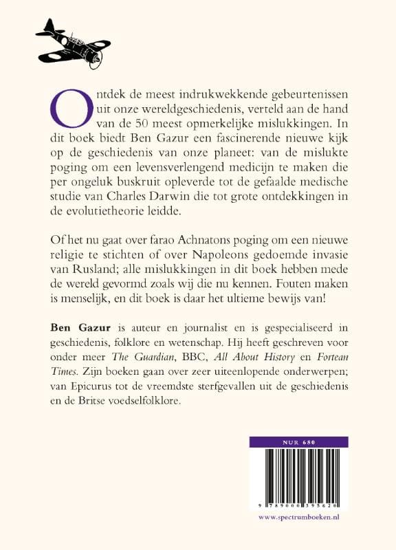 Ontdek de meest indrukwekkende gebeurtenissen uit onze wereldgeschiedenis, verteld aan de hand van de 50 meest opmerkelijke mislukkingen. In dit boek biedt historicus Ben Gazur een fascinerende nieuwe kijk op de geschiedenis van onze planeet: van de mislukte poging om een levensverlengend medicijn te maken die per ongeluk buskruit opleverde tot de gefaalde medische studie van Charles Darwin die tot grote ontdekkingen in de evolutietheorie leidde.
