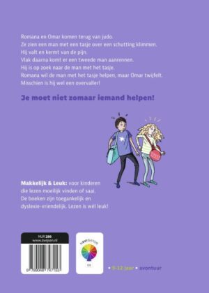 Een man wordt achtervolgd en springt over een schutting. Romana en Omar hebben alles gezien en wijzen de achtervolgers de verkeerde kant op. Ze helpen de man die door zijn val nu niet meer kan lopen, maar helpen ze de juiste persoon? Of is dit juist de boef? Hoe komt hij aan die tas vol juwelen? Spannend verhaal op AVI E5 voor kinderen van 9-12 jaar in de serie ‘Makkelijk & Leuk’, speciaal voor kinderen die lezen moeilijk vinden of saai. Zo krijgen zij weer plezier in lezen. Dyslexievriendelijk!