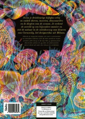Neem je driekleurige kijkglas erbij en ontdek dieren, insecten, dinosauriërs en de diepten van de oceaan. Je verkent de wereld op een bijzondere manier en ziet de natuur in de caleidoscoop van kleuren van Carnovsky, het designerduo uit Milaan.