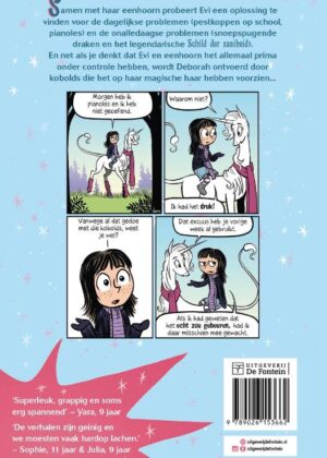 Net als je denkt: die Evi en eenhoorn hebben het allemaal prima onder controle, wordt Dakota ontvoerd door kobolds die het op haar magische haar voorzien hebben. Basisschoolproblemen en de worsteling om jezelf te zijn, maar dan vermengd met narcisme (eenhoorn), sarcasme (Evi) en een vleugje magie. Deze serie is smullen voor heel veel leeftijden.