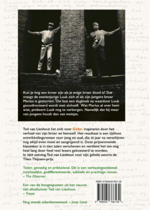 ‘Gebr.’ is een diep ontroerende, deels autobiografische, jeugdroman geschreven door Ted van Lieshout. Deze tijdloze coming-of-age-roman vertelt het verhaal van Luuk, een jongen die opgroeit in de schaduw van zijn overleden jongere broer, Marius. Met zijn poëtische schrijfstijl biedt Ted van Lieshout een diepgaande inkijk in de thema’s van rouw, verlies en familiebanden.