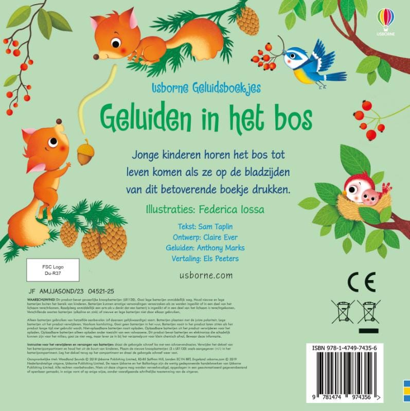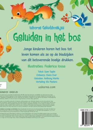 Als kleine kinderen op de bladzijdes van dit boek drukken, komt het bos tot leven. Elke mooie illustratie bevat eenvoudige tekst, kijkgaatjes en een knop, waarop je kunt drukken om het geluid van het bos te horen: een uil, koekoek, specht, ruisende bladeren en een kabbelend riviertje.