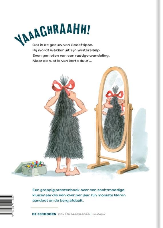 Gnoeftipoe wordt wakker uit zijn winterslaap. Eindelijk weer tijd om rustig te wandelen, te genieten van het mooie uitzicht en te zwaaien naar toevallige voorbijgangers – al merken die hem vaak niet eens op. En als ze hem tóch zien, maken ze zich meestal snel uit de voeten … Wanneer de sneeuwvlokjes beginnen te vallen, is het tijd voor de grote tocht. Gnoeftipoe doet dan zijn mooiste kleren aan en daalt de berg af. Lopen de mensen nog steeds weg?