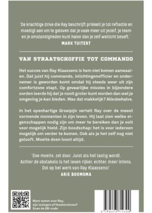 Het is niet altijd makkelijk om jezelf te zijn. Dat laat Ray Klaassens zien in zijn openhartige en avontuurlijke levensverhaal Groeipijn. Zijn innerlijk vuur bracht hem van de straten en bossen van Helmond, via de Koninklijke Militaire Academie naar bijzondere en gevaarlijke oorden. In de jungle van Belize, tijdens bombardementen in Beiroet en bij missies in het Midden-Oosten kon hij zich steeds verder ontwikkelen. Hij leerde: je wordt nooit groter dan wat je omgeving je kan bieden. Groeien doe je buiten je comfortzone. Daarvoor zijn lef, discipline en doorzettingsvermogen nodig.
