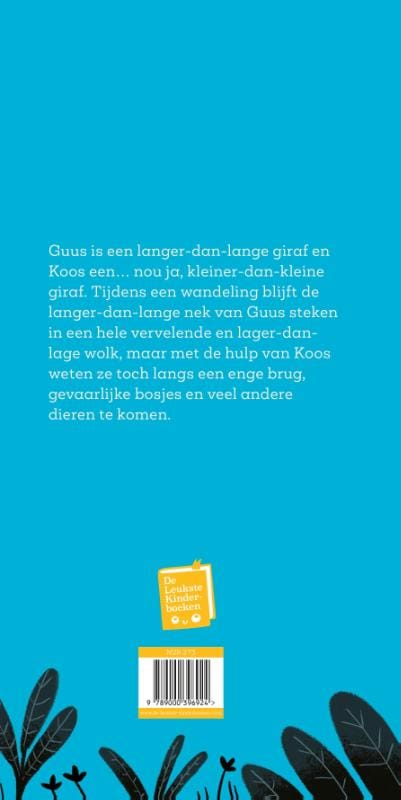 Guus is een langer-dan-lange giraf en Koos een… nou ja, kleiner-dan-kleine giraf. Tijdens een wandeling blijft de langer-dan-lange nek van Guus steken in een hele vervelende en lager-dan-lage wolk, maar met de hulp van Koos weten ze toch langs een enge brug, gevaarlijke bosjes en veel andere dieren te komen.
