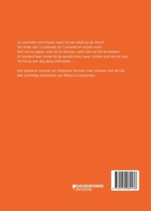 Ze noemden hem Haast, want hij was altijd op de vlucht.Hij rende van ’s ochtends tot ’s avonds en stopte nooit.Niet om te slapen, niet om te dromen, zelfs niet om lief te hebben.Al honderd keer rende hij de wereld rond, maar zonder ooit iets te zien.Tot hij op een dag Berg ontmoette …Een poëtisch verhaal van Stéphane Servant over omgaan met de tijd. Met prachtige illustraties van Rébecca Dautremer.