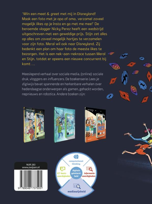 Aansprekend verhaal over social media, sociale (online) druk, vloggers en influencers voor lezers vanaf 10 jaar. ‘Win een meet & greet met mij in Disneyland! Verzamel zoveel mogelijk likes op je Insta en ga met me mee!’ De beroemde vlogger Nick Perez heeft een wedstrijd uitgeschreven met een geweldige prijs. Meral zet alles op alles om zoveel mogelijk hartjes te verzamelen voor haar foto. Maar Stijn wil ook naar Disneyland. Hij bedenkt samen met zijn vriend Amed een plan waarbij Stijns foto de meeste likes krijgt. Het is een nek-aan-nekrace tussen Meral en Stijn, totdat er opeens een nieuwe concurrent bij komt …