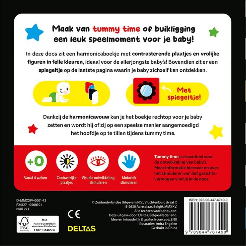 In deze prachtig vormgegeven doos zit een harmonicaboekje met contrasterende plaatjes en vrolijke figuren in felle kleuren, ideaal voor de allerjongste baby’s! Dankzij de harmonicavouw kun je het boekje rechtop zetten tijdens ’tummy time’. Tummy time of buikligging is de oefening waarbij je baby op de buik ligt terwijl hij of zij wakker is. Door het boekje voor je baby neer te zetten, wordt hij of zij uitgedaagd om het hoofdje op te tillen en zichzelf met de armen omhoog te duwen. De zwart-witpatronen en kleurrijke plaatjes in het boekje zijn speciaal afgestemd op de visuele vaardigheden van jonge baby’s. In de eerste maanden van het leven zien baby’s namelijk nog niet scherp en kunnen ze alleen sterke contrasten, zoals zwart-wit, goed onderscheiden. Bovendien zit er een spiegeltje op de laatste pagina waarin je baby zichzelf kan ontdekken. Gebruik dit vrolijke harmonicaboekje om van tummy time een leuk speelmoment voor je baby te maken en stimuleer tegelijkertijd de ontwikkeling van zijn of haar gezichtsvermogen tijdens de cruciale eerste maanden. Met extra informatie over tummy time en het stimuleren van het gezichtsvermogen in de doos.