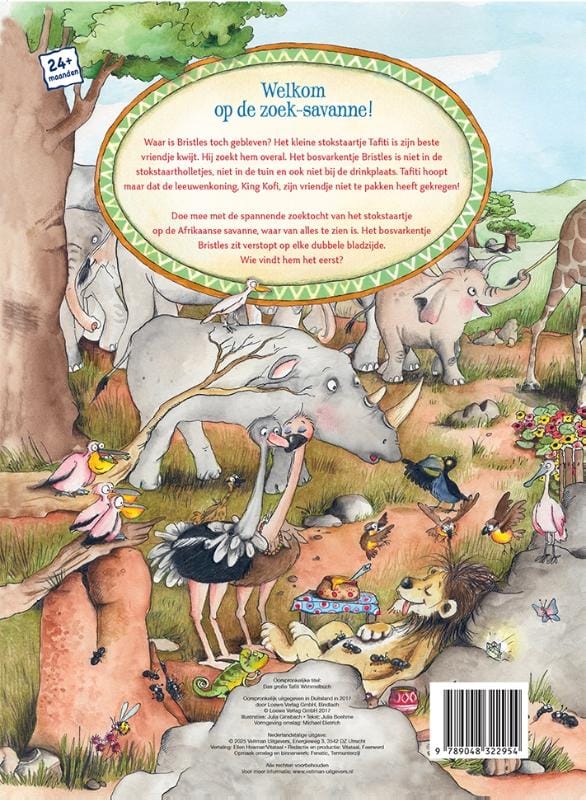 Doe mee met de spannende zoektocht van het stokstaartje op de Afrikaanse savanne, waar van alles te zien is. Het bosvarkentje Bristles zit verstopt op elke dubbele bladzijde. Wie vindt hem het eerst?