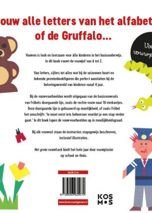 Vouwen met kinderen was nog nooit zó leuk! Het grote vouwboek biedt 75 originele vouwvoorbeelden waaraan kinderen met veel plezier zullen vouwen. Janet de Vink gaat daarbij uit van de basisvouwsels van de doorgaande lijn van Fröbel: rechte vouw (staand, liggend), recht kruis, schuine vouw, schuin kruis, 16 vierkantjes, vlieger, dubbel vierkant, dubbele driehoek, molenbasis en Fröbelbasis. Met deze basisvouwsels maakte Janet bekende prentenboekfiguren, zoals Rupsje Nooitgenoeg en Kikker, alsook cijfers en letters die met stappenillustraties na te vouwen zijn. Het grote vouwboek is een eigentijds vormgegeven knutselboek voor thuis en het basisonderwijs. Geschikt voor kinderen in de onderbouw.