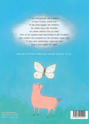 In de wei grazen de schapen in hun mooie, witte trui. In de poel liggen de varkens. Ze rollen door de modder. Dan zit er opeens een lammetje in de modder. Dat vinden de schapen en de varkens maar raar. ‘Ik ben een varkentje,’ zegt het lam. Dat is toch gek? Of niet?