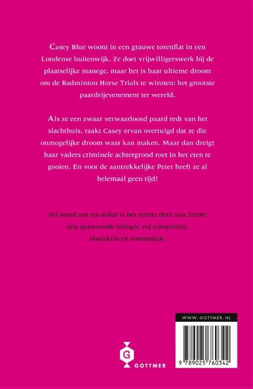 ‘Het paard van een dollar’ is het eerste deel in de Storm-serie van Lauren St. John – een serie paardenboeken voor lezers vanaf 11 jaar. Casey Blue woont in een grauwe torenflat in een Londense buitenwijk. Ze doet vrijwilligerswerk bij de plaatselijke manege, maar het is haar ultieme droom om de Badminton Horse Trials te winnen, het grootste paardrij-evenement ter wereld. Als ze een zwaar verwaarloosd paard redt van het slachthuis, raakt ze ervan overtuigd dat ze die onmogelijke droom waar kan maken. Haar vaders criminele achtergrond dreigt echter roet in het eten te gooien. En voor een jongen met ogen om in te verdrinken heeft ze al helemaal geen tijd!
