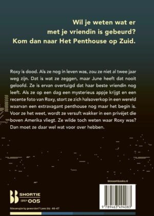 In de spannende thriller ‘Het penthouse’ gaat June op zoek naar haar vriendin Roxy die twee jaar geleden verdween. Men gaat ervan uit dat ze dood is, maar June heeft dat nooit geloofd. Als ze op een dag een mysterieus appje krijgt en een recente foto van Roxy, belandt ze halsoverkop in een wereld waarvan een extravagant penthouse nog maar het begin is. Voor ze het weet wordt ze versuft wakker in een privéjet die boven Amerika vliegt. Ze wilde toch weten waar Roxy was? Dan moet ze daar wel wat voor over hebben…