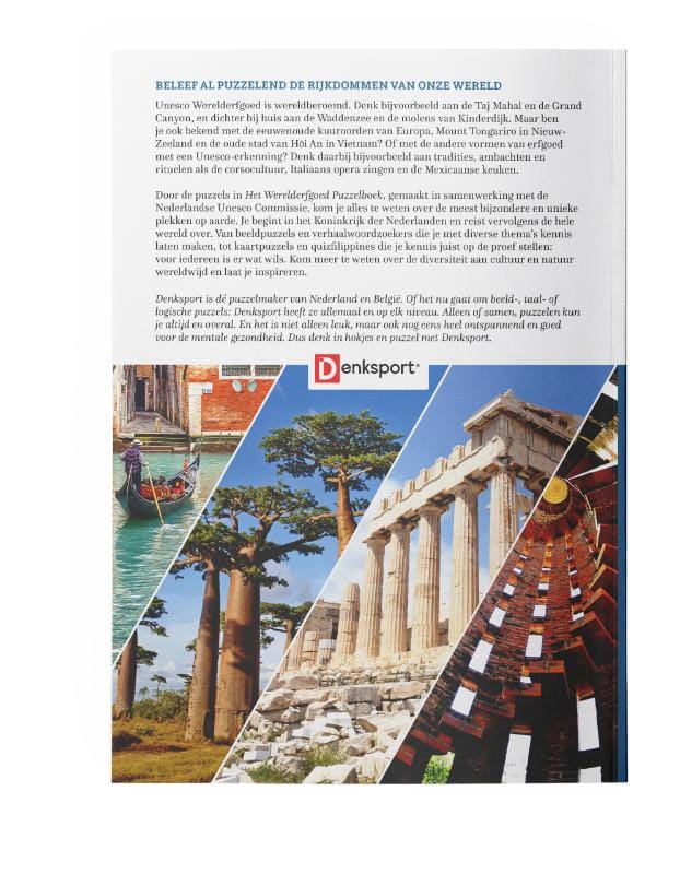 Door de puzzels in Het Werelderfgoed Puzzelboek, gemaakt in samenwerking met de Nederlandse Unesco Commissie, kom je alles te weten over de meest bijzondere en unieke plekken op aarde. Je begint in het Koninkrijk der Nederlanden en reist vervolgens de hele wereld over. Van beeldpuzzels en verhaalwoordzoekers die je met diverse thema’s kennis laten maken, tot kaartpuzzels en quizfilippines die je kennis juist op de proef stellen: voor iedereen is er wat wils. Kom meer te weten over de diversiteit aan cultuur en natuur wereldwijd en laat je inspireren.