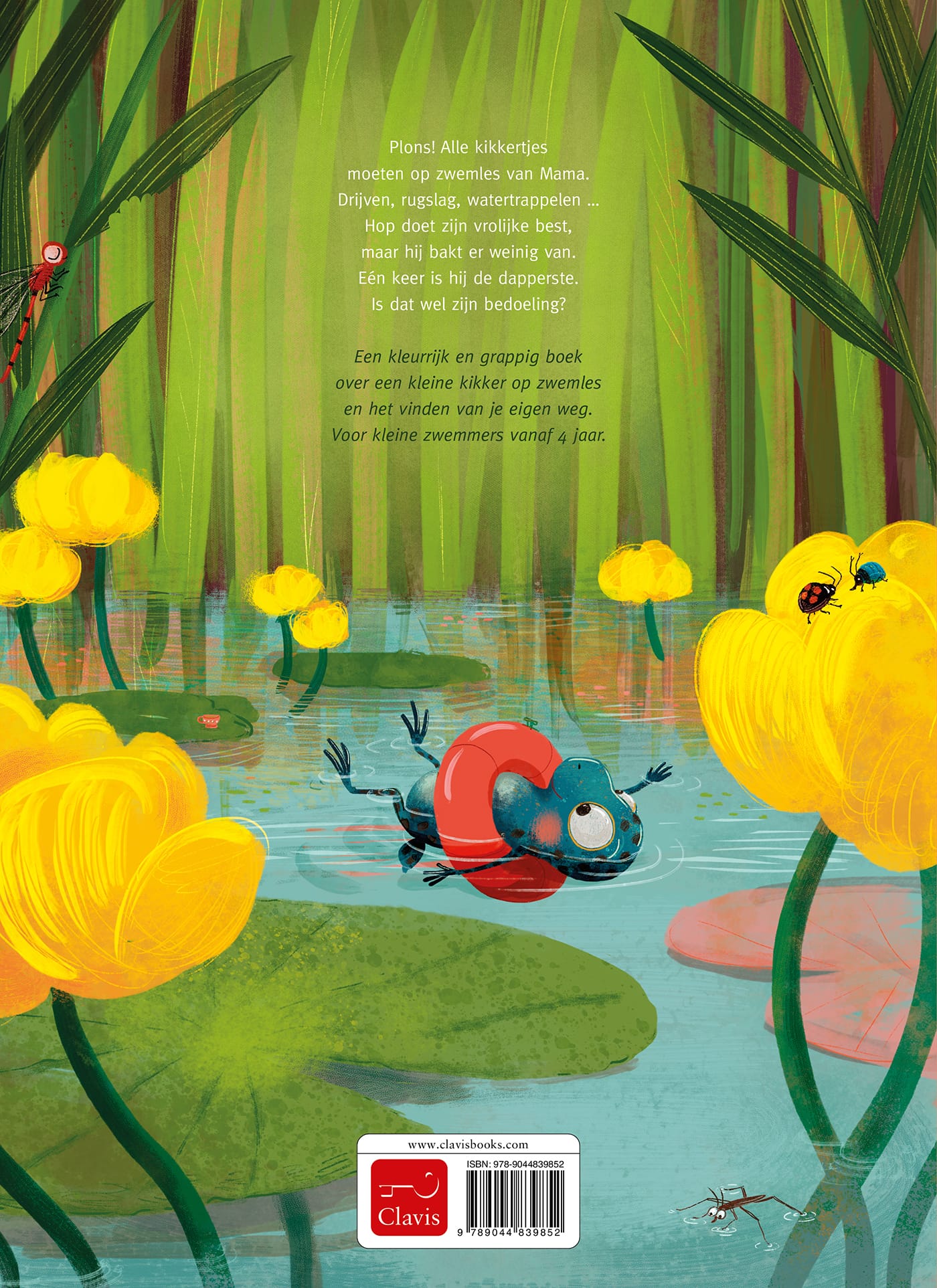 Plons! Alle kikkertjes moeten op zwemles van Mama. Drijven, rugslag, watertrappelen … Hop doet zijn vrolijke best, maar hij bakt er weinig van. Eén keer is hij de dapperste. Is dat wel zijn bedoeling?