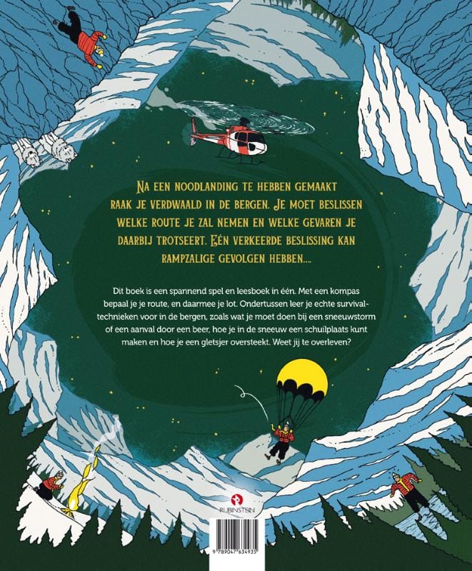 Na een noodlanding te hebben gemaakt raak je verdwaald in de bergen. Je moet beslissen welke route je zal nemen en welke gevaren je daarbij trotseert. Eén verkeerde beslissing kan rampzalige gevolgen hebben…. Dit boek is een spannend spel en leesboek in één. Met een kompas bepaal je je route, en daarmee je lot. Ondertussen leer je echte survivaltechnieken voor in de bergen, zoals wat je moet doen bij een sneeuwstorm of een aanval door een beer, hoe je in de sneeuw een schuilplaats kunt maken en hoe je een gletsjer oversteekt. Weet jij te overleven?