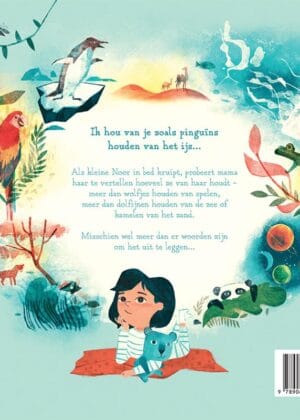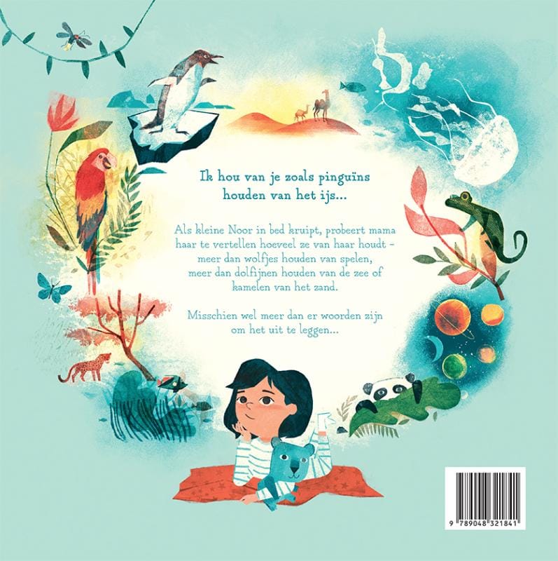 Als kleine Noor in bed kruipt, probeert mama haar te vertellen hoeveel ze van haar houdt – meer dan wolfjes houden van spelen, meer dan dolfijnen houden van de zee of kamelen van het zand.