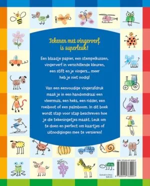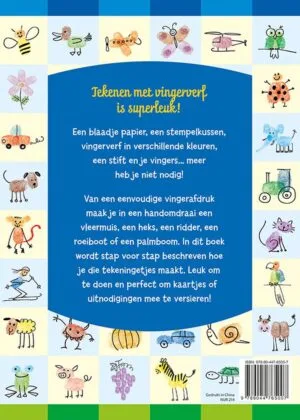Tekenen met vingerverf is superleuk! Met dit boek maak je van een eenvoudige vingerafdruk een origineel figuurtje: een vleermuis, een heks, een ridder, een roeiboot, een palmboom of nog iets helemaal anders. Dankzij de stap voor stap-beschrijvingen heb je in een handomdraai een leuke tekening. Veel teken- en verfplezier!
