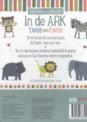 Kartonboekje met stevige tabs aan elke pagina. Vrolijke illustraties en rijmende tekst. Het bekende bijbelverhaal over de ark van Noach. Voor kinderen van 1 tot 3 jaar. Door de stevige uitvoering zeer geschikt voor de jongste kinderen om zelf in te bladeren. Een aantrekkelijk cadeau bij de doop van een kind.