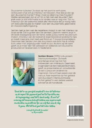 Jantien laat je zien wat de negatieve impact is van het interieur op onze aarde. Die is groter dan we denken. Daarom neemt ze je in dit boek stapsgewijs aan de hand, zodat jij duurzame keuzes kunt maken. Interieur van de toekomst staat boordevol praktische tips en biedt inspiratie met heel veel foto’s en 7 mooie binnenkijkers. Daarmee laat Jantien zien dat duurzaam ook écht hip & trendy is en zeker niet altijd duurder hoeft te zijn. Als kers op de taart geeft ze je meer dan 120 adressen en websites van duurzame producten en leveranciers in Nederland.