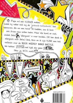 Pap wil een vlieger voor me maken, omdat hij denkt dat we dan vaker naar buiten gaan voor ‘frisse lucht’. Als we een hond zouden hebben, zou ik best een frisse neus willen halen. Maar die komt er niet, omdat Delia ‘allergisch’ is voor honden (ik denk dat ík allergisch ben voor Delia). Dirk, Nico en ik zijn flink met de band aan het oefenen voor de ROCK WEEKLY BAND BATTLE. We hebben nog hartstikke veel tijd, dus geen reden voor paniek (nou ja, nog niet!).