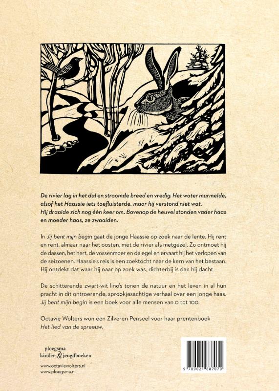 In Jij bent mijn begin van Octavie Wolters gaat de jonge Haassie op zoek naar de lente. Hij rent en rent, almaar naar het oosten, met de rivier als metgezel. Zo ontmoet hij de dassen, het hert, de vossenmoer en de egel en ervaart hij het verlopen van de seizoenen.