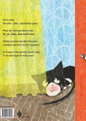 In het prentenboek ‘Joes de poes’ leer je de allerliefste poes van de wereld kennen: Joes! Maar zodra Joes gordijnen of een vissenkom ziet, staan de haren op zijn rug recht overeind. Dan springt hij in de gordijnen of klauwt naar Bubbels de vis, met als resultaat een gordijn vol gaten of een gesneuvelde vissenkom. Foei, Joes toch!