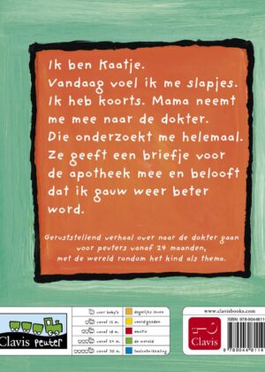 Ik ben Kaatje. Vandaag voel ik me slapjes. Ik heb koorts. Mama neemt me mee naar de dokter. Die onderzoekt me helemaal. Ze geeft een briefje voor de apotheker mee en belooft dat ik gauw weer beter word.
