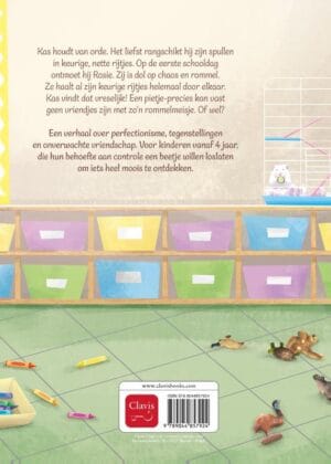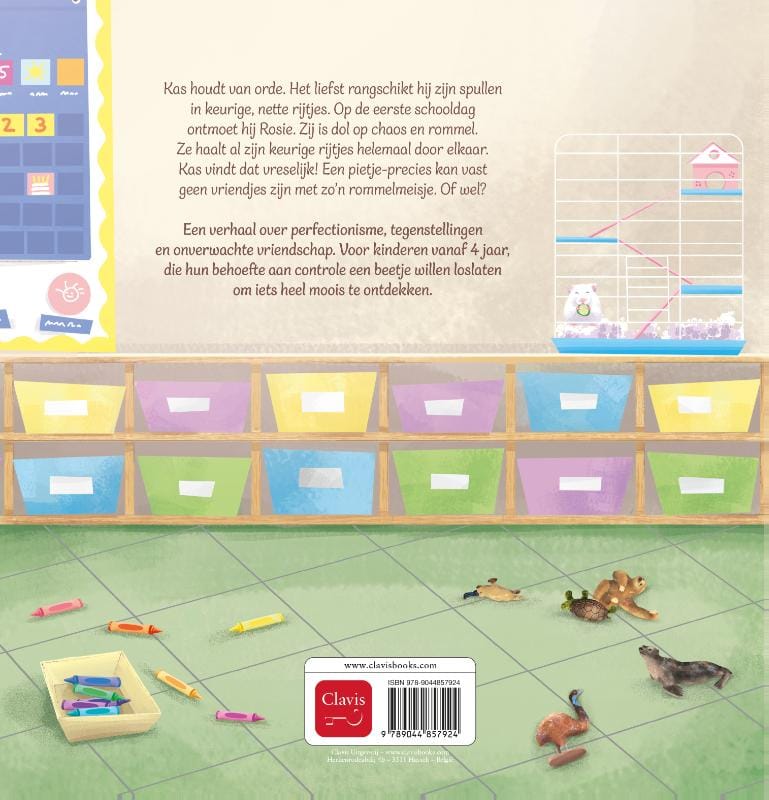 Kas houdt van orde. Het liefst rangschikt hij zijn spullen in keurige, nette rijtjes. Op de eerste schooldag ontmoet hij Rosie. Zij is dol op chaos en rommel. Ze haalt al zijn keurige rijtjes helemaal door elkaar. Kas vindt dat vreselijk! Een pietje-precies kan vast geen vriendjes zijn met zo’n rommelmeisje. Of wel?